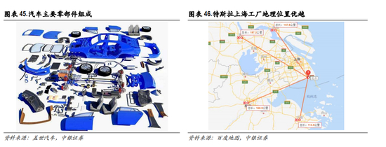 考虑到长途运输的成本,一般而言,体积大、重量大等运输成本较高的零部件汽车企业都会就近采 购,这也是大多数零部件企业都围绕整车生产基地形成产业集群的原因。因此特斯拉国产后,我们 可以预见首先国产化的将是车身、内外饰、电池、电机等零部件,后续主要零部件都将逐步国产化。