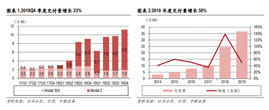 产销量略超市场预期。2019Q4特斯拉共交付 11.2万辆,同比增长 23%,略超市场预期,其中 Model 3 为 9.3万辆,Model S&X为 1.9万辆。2019年全年共交付 36.7万辆,同比增长 50%,其中 Model S/X交付 6.7万辆,Model 3交付 30.1万辆。