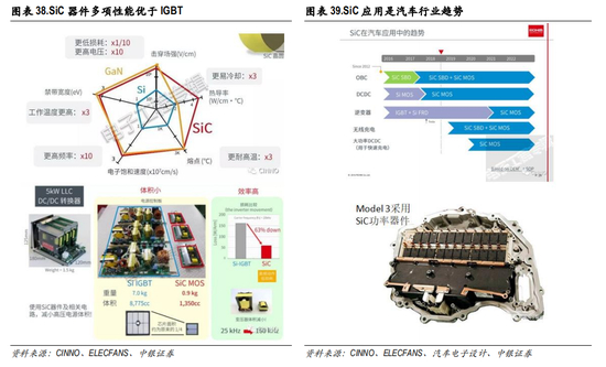 SiC MOSFET与传统 Si IGBT相比,具有以下优点:1)更低的阻抗,带来更小尺寸的产品设计和更高 的效率;2)更高频率的运行,能让被动元器件做得更小;3)能在更高温度下运行,意味着冷却系 统可以更简单。以某款 5kW的 DC/DC转换器为例,其电源控制板采用 SiC MOSFET后,与原有 Si IGBT 相比,重量降低 87%,体积降低 85%,损耗下降 63%。