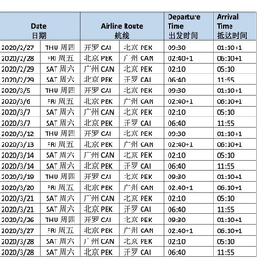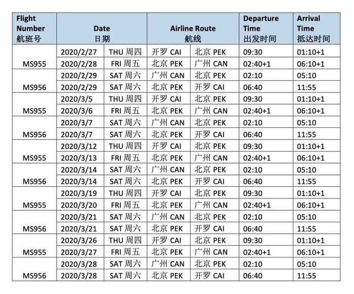 新京报讯(记者 曲亭亦)2月21日,埃及航空公司宣布,将在2020年2月27日至2020年3月28日期间,执飞开罗-北京-广州、广州-北京-开罗的航线。