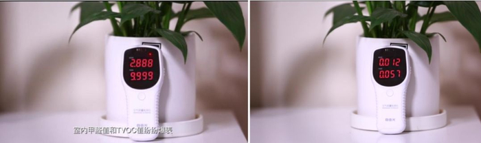 首先,我们用专业仪器测出房间的初始TVOC值为0.282mg/m³,初始甲醛值为0.055mg/m³。接着我们在房间内使用喷漆,模拟装修场景,此时,TVOC值爆表,达到9.999mg/m³,甲醛值也猛增至2.888 mg/m³。
