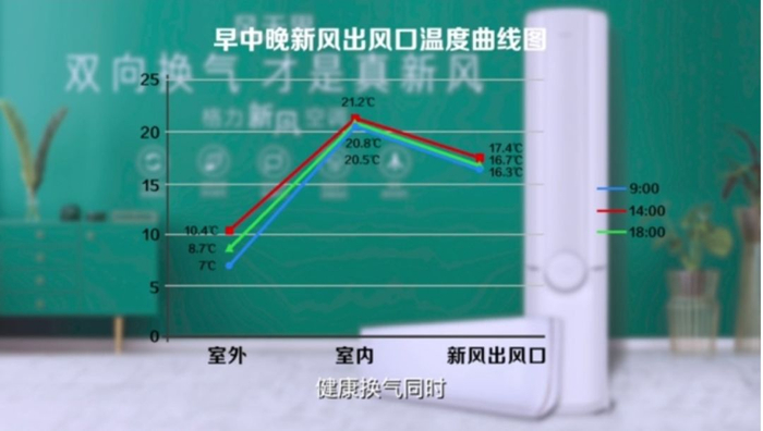 首先,我们将格力新风空调的温度调至21℃,并保持全天开启,营造一个相对稳定的室内温度。接着我们选取了9:00、14:00、18:00三个时间点,分别测试室外温度、室内温度和格力新风空调的出风口温度进行对比,数据显示,无论是早上(7℃、20.5℃、16.3℃)、中午(10.4℃、21.2℃、17.4℃)还是晚上(8.7℃、20.8℃、16.7℃),即使室外温度在不断变化,但室内温度与新风空调出风口的温差始终保持在5℃以内。