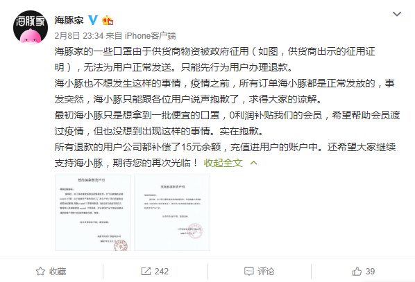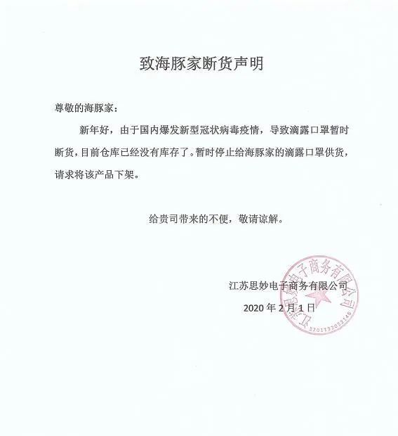 无论是公开道歉,还是面对《消费者报道》的质疑,海豚家均将此次事件的原因归结为,“供货商物资被政府征用,无法为用户正常发送口罩”,在2月8日的微博道歉中,海豚家还附上了两家口罩供应商的断货声明。