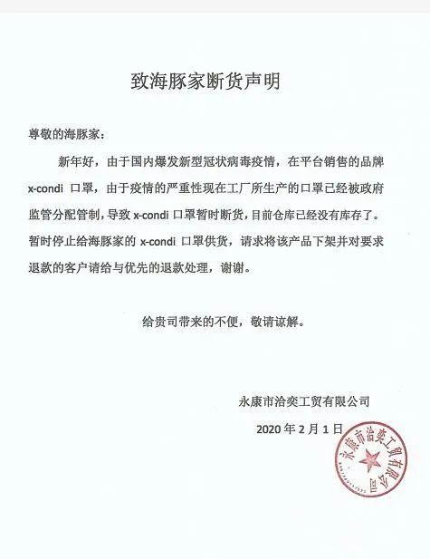 ▲两家口罩供应商的断货声明落款均为2月1日