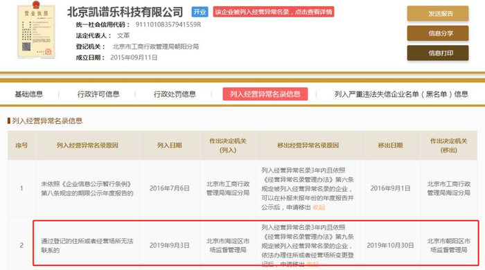 ▲海豚家股东北京凯谱乐科技有限公司被列入经营异常名录