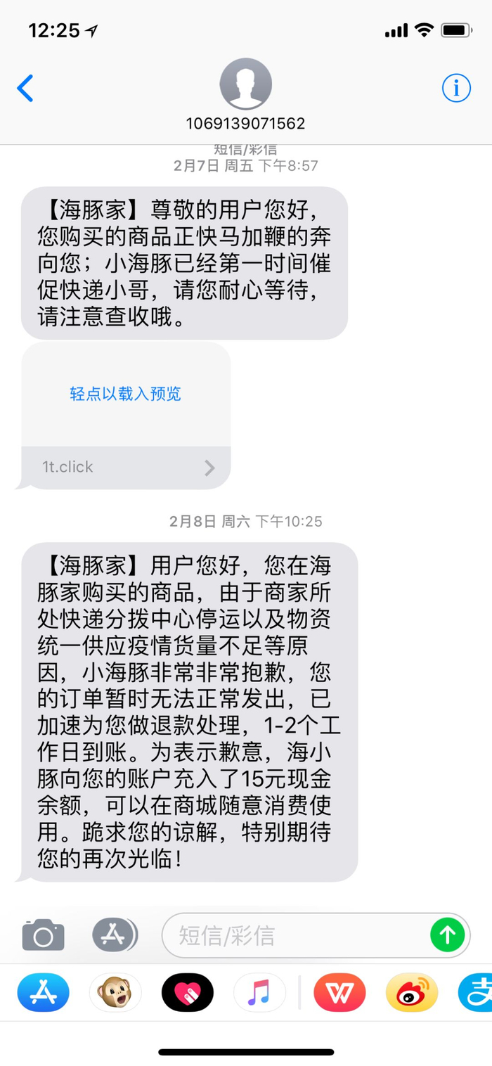 然而,黄女士购买的口罩却迟迟没有送到。“2月5日海豚家App就显示发货了,但是没有看到快递单号。”黄女士怀疑海豚家虚假发货。2月8日晚上,黄女士收到了海豚家发来的一条短信,表示“由于商家所处快递分拨中心停运以及物资统一供应疫情货量不足等原因”,“海豚家将会为黄女士的订单作退款处理,并赔偿15元现金余额。”