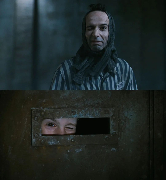 其中有个细节是,将老人孩子们驱赶进毒气室“洗澡”的女军官不慎摔倒,被圭多的绅士叔叔扶起后她表情呆滞双目无神,这个镜头仅仅一闪而过。这很难不让我联想到另一部同样聚焦个体且以二战为背景的电影——《朗读者》。