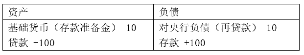 下表表示,央行通过再贷款,向银行投放10元基础货币,并将这些钱存在央行账户里,形成存款准备金: