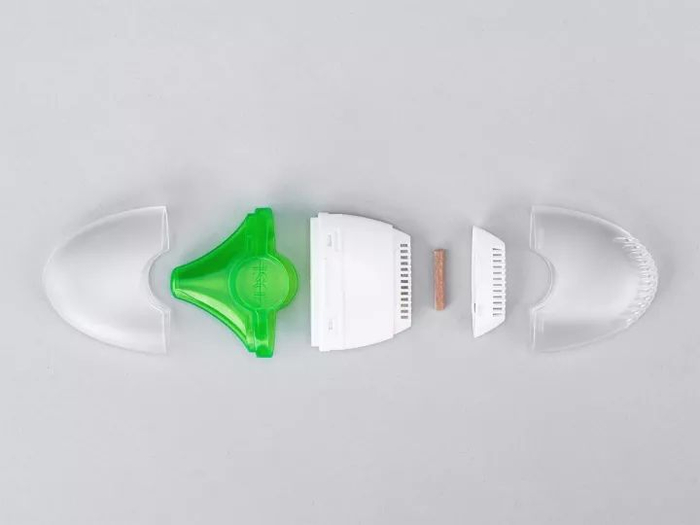 盐颗粒就装在这个盐盒里。顶部有透气孔,与绿色的吸入口连接,使用时挥发的盐微粒会由此上升进入人体。