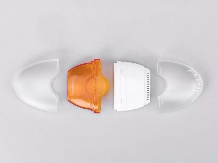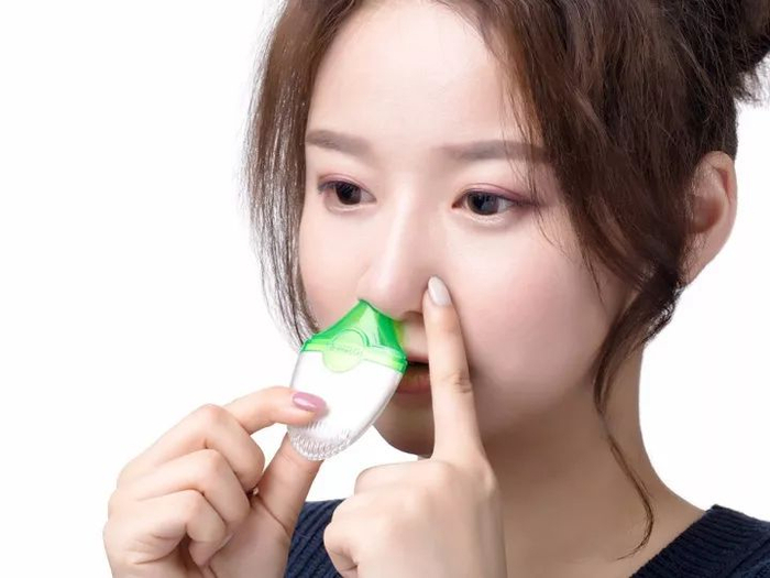 1、拆开上盖,轻轻将盐疗器的吸入管放入一侧鼻孔中,用手指堵住另一侧鼻孔后进行吸气;