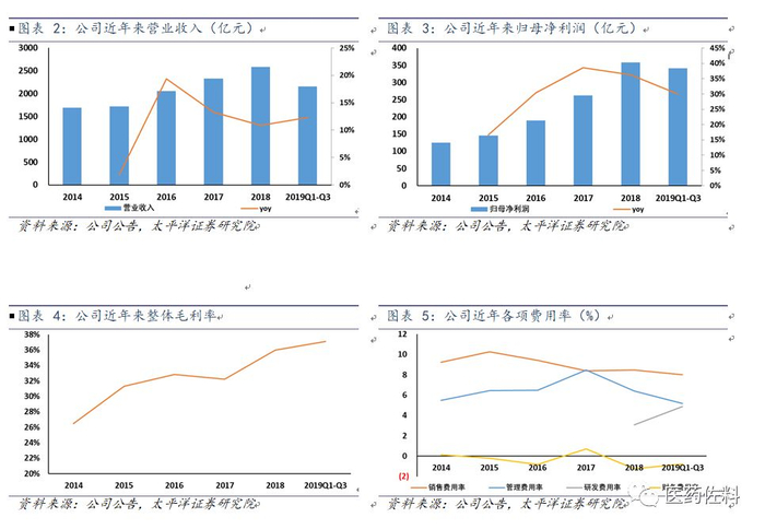 公司近年来业绩快速增长,收入端增速保持在10-15%;归母净利润增速自2016年起均超过30%,快于收入增速,主要是由于:1)产品结构优化,高毛利的一类模制瓶、棕色瓶收入占比不断提升;2)完整的产品线以及产业链格局形成了明显的规模生产优势规模优势,体现在采购和管理成本降低,毛利率提升和各项费用率基本持平或小幅下降;3)激励措施到位,公司释放业绩动力较为充足。