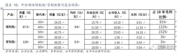 我们对注射剂一致性评价开始后,中性硼硅玻璃模制/管制瓶潜在替代需求市场空间进行了测算。按30%-50%不等的替代率进行测算,中性硼硅模制瓶市场空间为15.75-26.25亿元,此外中性硼硅模制瓶也广泛用于血制品、对比剂等增速较快的产品之中,在上述测算的基础上,该产品销售峰值仍有较大幅度提升空间。假设毛利率为60%,公司市占率为90%,测算仅中性硼硅玻璃模制替代需求可增厚公司毛利约8.51亿元-14.18亿元,占2018年毛利比例为91-152%。