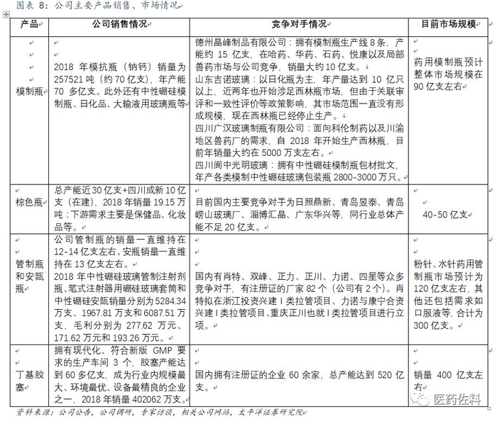 管制瓶竞争较为激烈,国内还有肖特、沧州四星、双峰格雷斯海姆、欧壁医药包装和正川股份等多家企业生产。公司已购置有10条安瓿生产线,2条玻璃套筒(卡式瓶)生产线,10条管瓶生产线,合计共22条生产线,形成年产6.87亿支一级耐水药用玻璃瓶的产能规模。公司也储备有中性硼硅管制瓶拉管技术(2018年年报披露的研发项目中有“一类耐碱药用玻璃开发”、“一类管瓶镀膜关键技术开发”等),长期来看具有成为国内中性硼硅管制瓶龙头的潜力。
