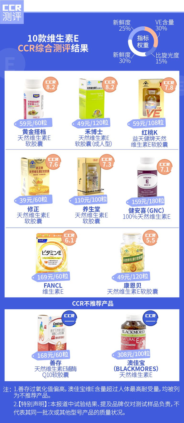 2019年11月,《消费者报道》向权威第三方检测机构送检了热销的10款维生素E产品,详细请看《10款维生素E测试:不推荐善存及澳佳宝,这2款表现不错!》。