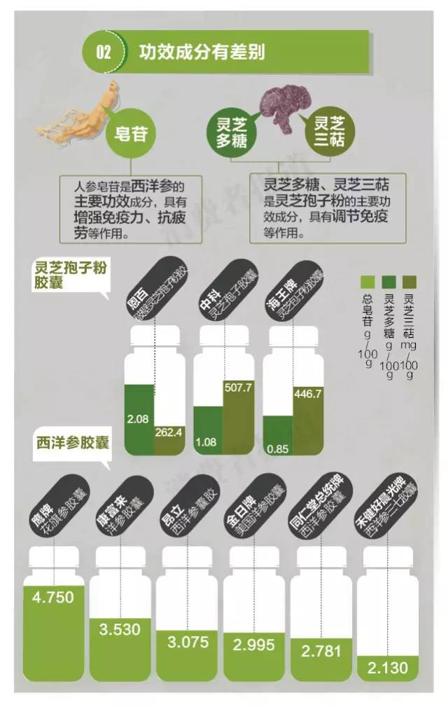 虽然西洋参中人参皂苷、灵芝孢子粉中的灵芝多糖、灵芝三萜具有调节免疫或增强免疫的作用,但根据测试结果,保健产品中所含的功效成分较为有限。