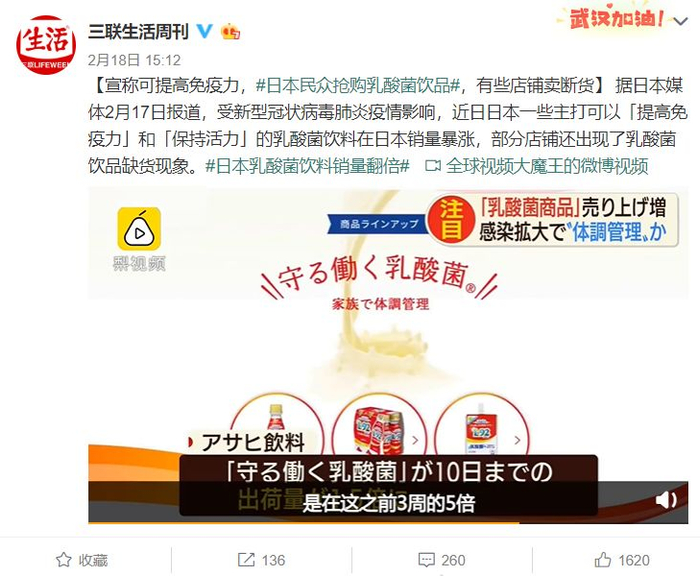 在我们在抢购双黄连的时候,在海的另一边,日本的民众在抢购乳酸菌饮品。据日本媒体报道,一些宣称“提高免疫力”“提高活力”的乳酸菌饮品在日销量暴涨,如明治、麒麟、朝日等品牌旗下乳酸菌饮料出货量大幅增长。