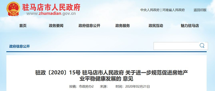 2月21日,河南省驻马店市人民政府发布《关于进一步规范促进房地产业平稳健康发展的 意见》,从供需两端出台17条稳地产组合拳。
