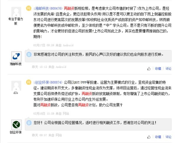 在市场情绪一片火热之下,投资者们也为上市公司操碎了心。在交易所的互动平台上频繁喊话,要求公司尽快开展再融资事宜。在过去的一周里,上证e互动涉及提问共有33条,喊话深交所公司的数量则接近200条。