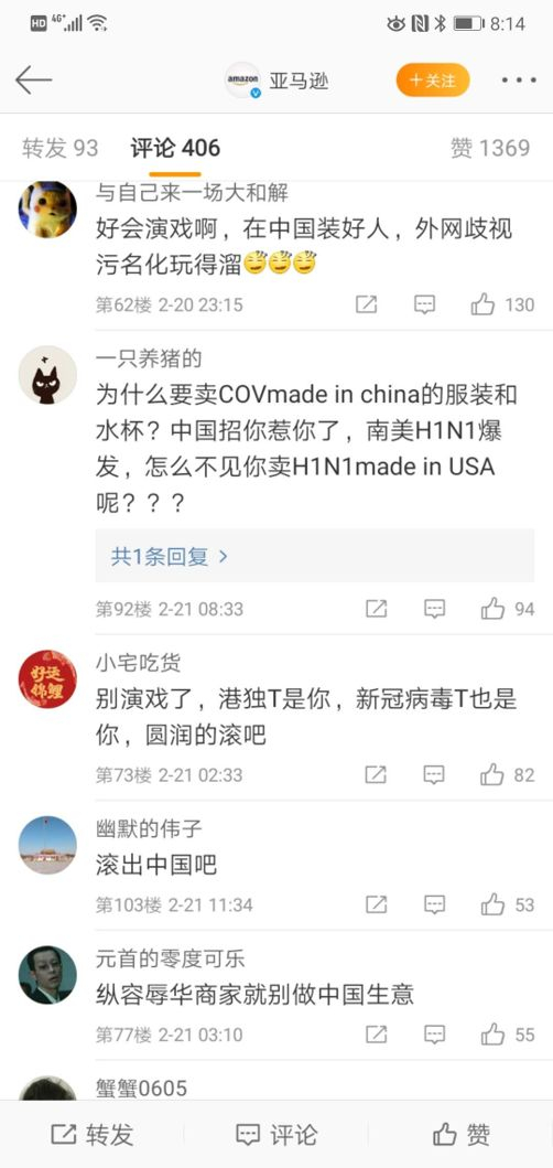 2月20日晚,多位微博网友曝出,亚马逊海外英文商城上公然兜售印有“新冠病毒中国制造(Coronavirus Made In China )”字样的T恤衫、连帽衫、水杯等商品。