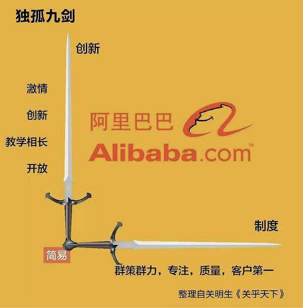 在文化方面,关明生确定了阿里巴巴第一版价值观,也就是下图中的“独孤九剑”。后面又陆续有了“六脉神剑”、“九阳真经”,2019年阿里巴巴重新升级“新六脉神剑”。