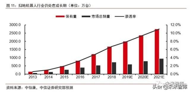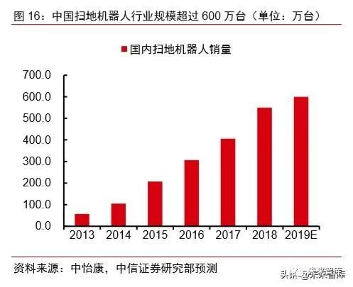 家庭场景的服务机器人发展前景广阔,扫地机器人已率先破局,国内市场空间约 300 亿元。从 2014 年到 2019 年,国内扫地机器人销售量从 105 万台上升至超过 600 万台, CAGR 均超过 40%。复盘扫地机器人发展历史,技术迭代和价格下降是行业发展的两条主 线。(1)技术迭代:除了随机—规划—智能这样的大的技术迭代外,扫地机行业还有大量 的微创新,例如加入边刷、手机 app 控制、扫拖一体等。每一次大的技术迭代周期,行业 格局都会被重塑,技术落后的企业被淘汰,站在技术前沿的企业崛起;(2)价格下降:在 技术发展相对平稳的时期,竞争的关键是性价比,在这一点上国内企业无疑占据着优势。目前,在国内市场,科沃斯市占率约 45-50%,石头科技市占率约 25-30%。长期来看,按 照扫地机器人渗透率提升至 25%计算,对应国内市场空间约 300 亿元,是目前市场空间的三倍。在家用场景中,除扫地机器人外,擦窗机器人、空气净化机器人、陪护类机器人也 值得关注。