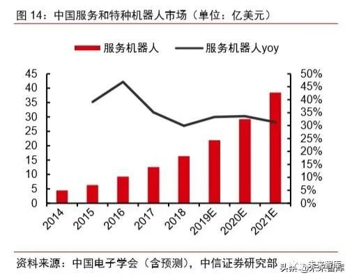 服务机器人行业处于成长期,2019 年,全球/中国的服务机器人行业规模为 94.6/22.0 亿美元。服务机器人一般可以分成专业服务机器人和个人/家庭服务机器人。(1)专业服务 机器人:属于 to B 的产品,应用于物流、医疗、电力、建筑等服务行业,其需求主要来自 于各个服务行业的自动化需求和辅助需求。(2)个人/家庭服务机器人:属于 to C 的产品, 主要应用于家庭环境,满足客户在娱乐、教育、陪护、家务等方面的需求。根据中国电子 学会的统计和预测,2019 年,全球/中国的服务机器人行业规模为 94.6/22.0 亿美元,同比 +14.1%/+33.3%,5 年 CAGR 为+21.9%/+36.8%。