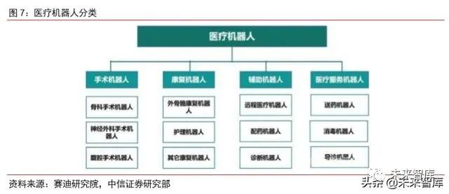 医疗机器人分为手术机器人、康复机器人、辅助机器人、医疗服务机器人四大类。根 据赛迪研究院的数据,2019 年,国内医疗机器人市场规模 43.2 亿元,占服务机器人市场 规模的 28.2%。其中,康复/辅助/手术/医疗服务机器人分别占比 47%/17%/23%/13%。此 次疫情中,主要投入使用的是医疗服务机器人中的消毒机器人产品。