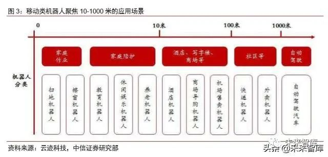 配送机器人聚焦 10-1000 米领域。移动类机器人的活动范围可以分为四类:(1)0-10 米:家庭场景。主要分为家庭作业类和家庭陪护类。该类场景的环境复杂度较低。(2)10-100 米:酒店、写字楼、商场等场景。该范围多为室内环境,人员流动大、环境相对多变,对 机器人的性能要求较高。(3)100-1000 米:社区等场景。该范围多为室外环境,相比于 室内环境,光线强度变化较大,环境复杂度更高。(4)1000 米以上:自动驾驶等场景。近年来,随着低成本的导航移动方案有了很大的提升,很多企业围绕导航移动开展了商用 化的探索。