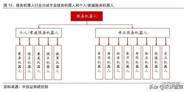 服务机器人产业链包括底层硬件、技术模块、终端产品。(1)底层硬件:主要包括芯 片和各类传感器; (2)技术模块:基于底层的芯片和传感器,以及配套的算法,能够开发 出导航移动、运动控制、感知交互(视觉、语音)等技术模块;(3)终端产品:服务机器 人终端产品是技术模块与功能组件的组合,其中,技术模块是服务机器人智能性的基础,而功能组件决定其应用领域。例如,科沃斯的技术模块主要是室内导航移动技术,功能组 件是清扫和拖地的零部件。