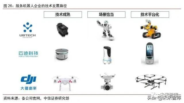 服务机器人全产业链上国内都有全球领先的企业,核心部件并不受制于国外供应商。在底层硬件领域,中国拥有寒武纪和地平线等芯片企业,思岚科技和镭神智能等传感器企 业。在技术模块领域,中国拥有科大讯飞(语音)、商汤科技(视觉)、奥比中光(体感)等企业。在终端产品领域,中国已经诞生了大疆创新、科沃斯、石头科技、优必选、九号智能等一批已经成功实现商业化的企业。产业链上不同环节的国内企业形成了正反馈机制,优秀的底层硬件和技术模块企业帮助国内终端产品企业不断提升产品性能,而大量终端产 品的销售和用户反馈又给硬件和技术企业提供了打磨和迭代自身技术的机会。