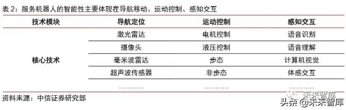 服务机器人的智能性主要体现在导航移动、运动控制、感知交互(视觉、语音)这几 项技术。我们认为,目前的技术成熟度排序是导航移动>运动控制>感知交互。基于导航移 动技术的扫地机器人、物流机器人、无人机是最早成熟的子行业;基于运动控制的舵机玩具机器人也在快速成长中;而基于语音交互的儿童陪护机器人和商场导购机器人虽然数量 众多,但由于技术限制,目前仍然难以完全满足用户的需求。