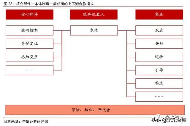 国内正逐步形成核心部件—本体制造—集成商的上下游合作模式,配套的保险等服务 也开始出现。在服务机器人行业发展初期,产业生态并未建立起来,很多企业不仅需要投入研发上游的核心部件,还需要直接开展市场推广活动。我们看到,未来在发展较成熟的子行业中,已经出现类似工业机器人行业的“核心部件—本体制造—集成商”的上下游模 式,服务机器人企业通过外购的方式获得核心部件,自身专注于本体产品的开发制造,再交由下游的集成商来做市场推广。在无人机行业,这种上下游合作的模式正在实践中,例如,大疆生产农业植保无人机,各地的植保队购买大疆的无人机来为农户提供植保服务。近年,大疆通过降低农业植保无人机的价格来培育下游的植保队的规模,同时也提供飞手 培训和无人机保险等服务,整个无人机的生态体系正在逐步完善。