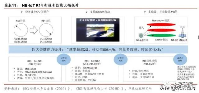 NB-IoT 是万物互联发展的先行者。NB-IoT 具有超低功耗,超低成本,超强覆盖,超大连 接等特点。其相比基于 LTE 演进的 eMTC 技术具有更低成本、更长续航时间属性,针对 成本敏感但是终端数量较大的应用场景,在物联网发展初期阶段获得核心优势。而相比 Lora、SigFox 等非授权频谱物联网技术,其更是具备网络部署成本低、干扰较小、数据 安全性高等特点。随着 5G R16 版本将支持其接入 5G 核心网络,NB-IoT 将成为物联网海 量连接的主力军。