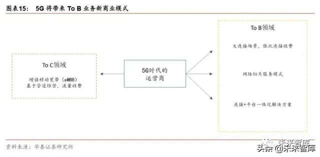 To B 业务具有连接、网络切片以及解决方案等多元化商业模式。在 5G 时代,运营商在 To B 增量场景的推动下将迎来新的商业模式,有别于 To C 业务“管道化”的角色。第一 方面,5G 带来大规模连接,对应连接设备和模组等收费;第二方面,5G 时代运营商可根 据网络切片服务实现对垂直行业用户收费;第三方面,运营商可依托 5G 网络服务提供商 的角色优势,为客户提供连接+平台的一体化解决方案。