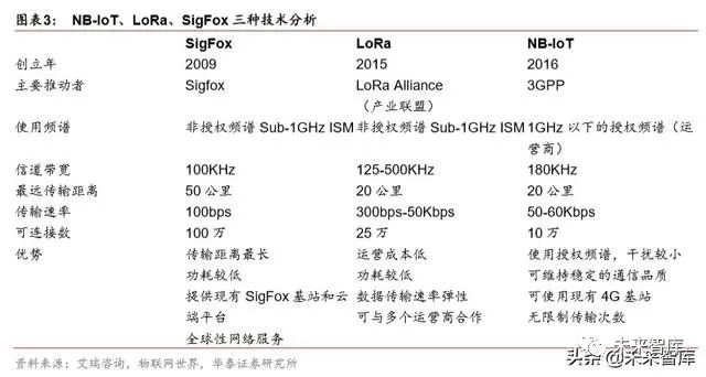 相比此前主流的 LoRa、SigFox 技术,NB-IoT 由运营商强力推出。LoRa WAN 是由各产 业联盟共同推动的网络标准,提供开放式技术;Sigfox 则是由法国同名公司自行开发的技 术,掌握核心网络的建设和营运,在全球范围内进行网络部署。LoRa 与 Sigfox 都具有长 距离、低功耗的特点,可延长电池寿命,形成大范围的讯息传输,且均使用非授权的 Sub-1GHz ISM 频段,不需额外付出授权费用。NB-IoT 则大有不同,使用需授权的 GSM 和 LTE 频段,且 不需重新布建网络,只要更新软件,就能使用现有的 4G 基站和相关设备。