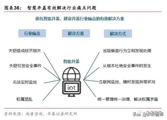 智慧井盖市场规模超千亿。传统的井盖管理以人工巡检为主,不能第一时间获悉井盖丢失 信息,井盖丢失找不到责任人,人力维护成本高,人员监督管理难。井盖中内嵌 NB-IoT 的智能监控设备平台,可实时监测到井盖开合状态、井上路面积水、井下水位等情况,并 进行动态分析。根据尚普咨询数据显示,一二线城市智能井盖市场规模约为 277 亿元,全 国智能井盖市场规模约为 1114 亿元。