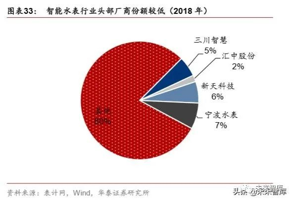 国内从事水表行业企业超过 400 家,特别是传统低端水表生产企业居多。领先厂商分别为 三川智慧、汇中股份、新天科技和宁波水表。从智能水表市占率情况来看,收入体量较大 的宁波水表市占率仅为 7.14%,可以看出竞争格局较为分散。