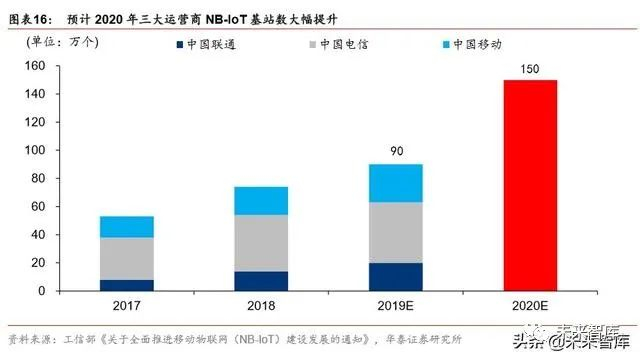 预计 2020 年三大运营商 NB-IoT 基站规模将达 150 万,较 2019 年的 90 万增长明显。根 据中国信通院无线电中心副主任潘峰在 2019年NB-IoT千行百业“亿”启航生态峰会上表示, 2019 国内三大运营商 NB-IoT 基站数已达到 90 万,根据 2017 年 6 月 6 日,工信部办公 厅正式下发《关于全面推进移动物联网(NB-IoT)建设发展的通知》显示,计划 2020 年 我国 NB-IoT 基站规模将达到 150 万个,实现对于全国的普遍覆盖以及深度覆盖。