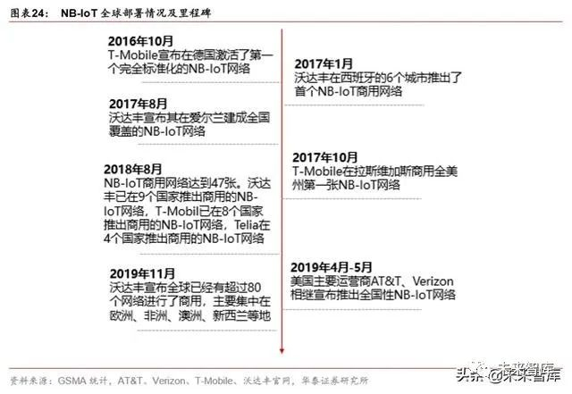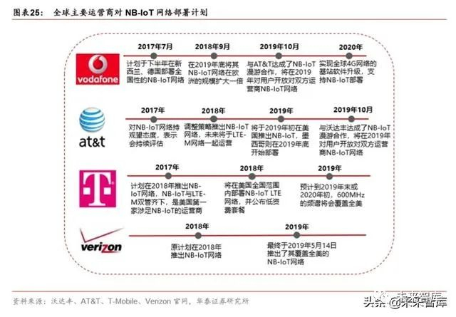 NB-IoT 是目前全球主流运营商支持的标准技术。全球范围内,自 2017 年以来,主流运营 商对 NB-IoT 部署不断加码。其中欧亚市场开始较早,美国主要运营商对 NB-IoT 先持观望 态度,随后于 2018 年,NB-IoT 凭借技术和产业优势在美国成功翻盘,美国市场成为四家 主要运营商(AT&T、Sprint、Verizon、T-Mobile)新的角逐场。NB-IoT 的领军运营商沃 达丰发挥全球管道优势,与华为等合作伙伴共同开发公共事业、医疗、智慧城市等行业。