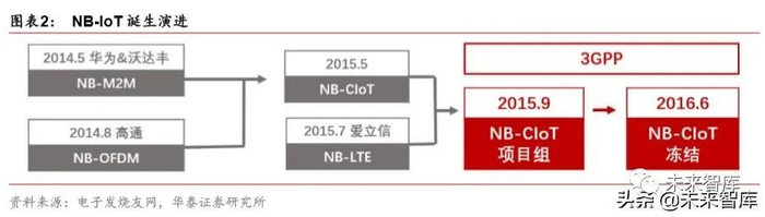 2014年 5月华为、Vodafone提出了NB M2M技术,而后 2015年 5月又进化成 NB-CIoT, 2015 年 7 月,Nokia、Ericsson、Intel 提出了 NB-LTE 技术,随后 3GPP 着手制定标准, 并在 2016 年 7 月确定标准,至此 NB-IoT 正式诞生。