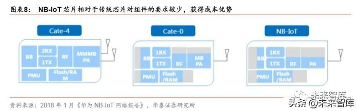 第三大特点:超低成本。在网络层,NB-IoT 在现有 LTE 网络的基础上进行升级改造,大 大降低了网络建设与维护成本,尤其利用目前国内 4G 基站覆盖率较高优势,是运营商推 行 NB-IoT 技术快速普及的主要驱动力。在终端方面,NB-IoT 芯片专为物联网设计,各组 件要求更少,使得厂商采购成本更低。