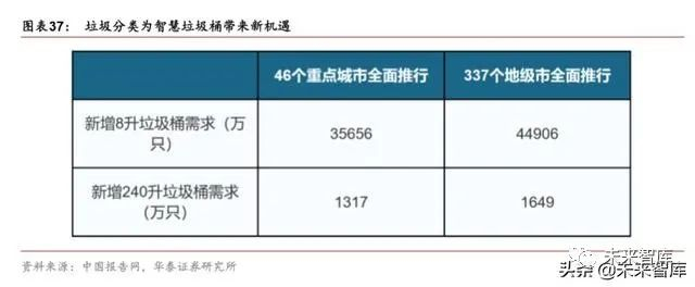 垃圾分类大势所趋,智能垃圾桶构建智能环卫系统。2019 年我国垃圾分类工作已由点到 面逐步启动,全国 46 个重点城市垃圾分类工作取得积极进展,到 2025 年,全国地级及 以上城市基本建成生活垃圾分类处理系统。随着垃圾分类全国性开展,智能环卫系统的发 展势在必行。一方面,基于“低功耗,广覆盖”以及 NB-IoT 的定位能力,市政管理部门 能合理安排环卫人员工作任务与清洁路径,使环卫效率大大提高;及时判断并定位区域内 垃圾桶异常情况,快速进行干预与处理;另一方面,还可自动垃圾识别让垃圾分类更高效, 并实现有效监控。根据中国报告网数据显示,46 个重点城市垃圾桶需求量为 3.70 亿个, 337 个地级市垃圾桶需求量为 4.66 亿个。