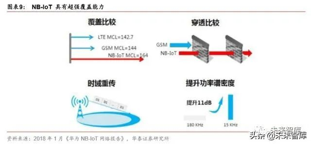 第四大特点:超强覆盖。通过时域重传技术和提升功率谱密度,根据《华为 NB-IoT 网络 报告》内容,相比 GSM 提升了 20dB 的 MCL(传送数据时设备和基站的天线端口之间的 最大总信道损耗,MCL 值越大,链接越强大,信号覆盖范围越广),覆盖距离达到了 GSM 的三倍,穿透能力相当于比 GSM 能多穿透两堵墙。