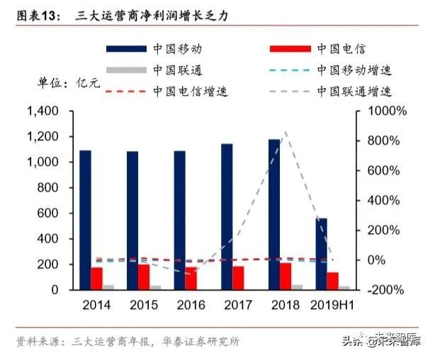 运营商整体营收和净利润增速下降。虽然运营商用户流量逐月大幅增长,但单价下降较快, 导致三大运营商 2019H1 营业收入增速均有所下降,2019 H1 中国移动、中国电信和中国 联通营收分别为-0.61%、-1.32%和-2.78%;从净利润情况看,除中国联通受到混改红利 影响 2018 年净利润大幅提升,中国移动和中国电信净利润增速均有所下降,中国移动 2019H1 首次出现净利润下滑。