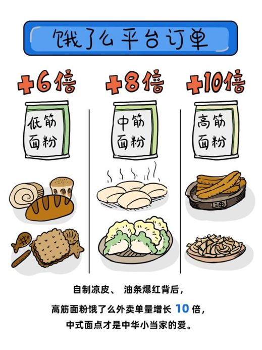 在饿了么上,高筋面粉外卖单量增长10倍,中筋面粉增长8倍,低筋面粉增长6倍。