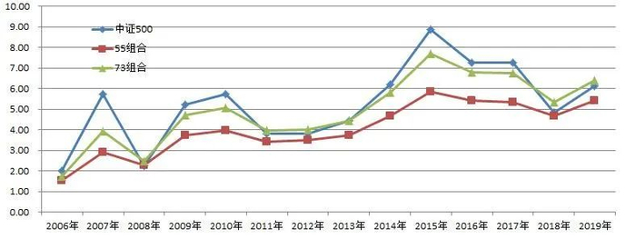 55组合最大的年度跌幅只有满仓股票指数的1/3左右,但是累计收益接近。