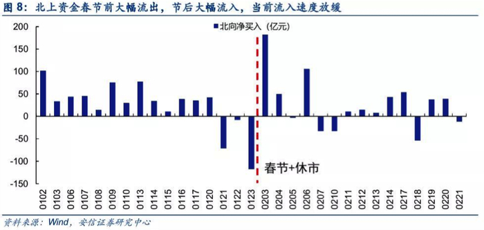 但与之相反的是,境外资金持续流入速度出现边际放缓。春节假期和短暂休市之后,2月3日起之后连续3天,境外资金大肆买入182亿元。但2月18日以后,随着A股春节后“洼地”被填平,境外资金流入的节奏开始放缓。
