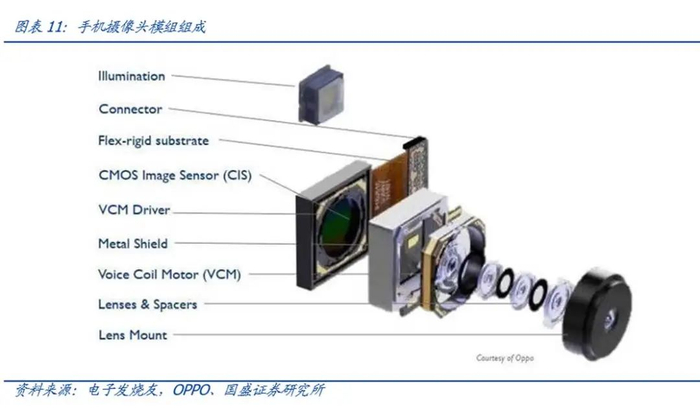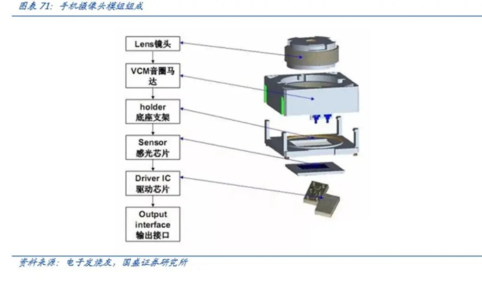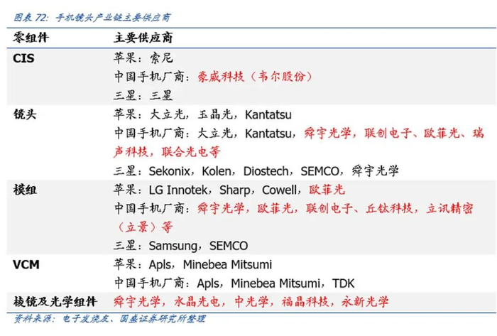 手机摄像头对应的产业链企业包括图像传感器制造商、模组封装厂商、镜头厂商、马达供应商、棱镜、滤光片供应商等。由于行业技术壁垒和集中度高,产业链的龙头多为日本、韩国、中国台湾所垄断,大陆的厂商主要集中在棱镜、红外滤光片和镜头模组封装上,其中CMOS厂商包括豪威(韦尔股份),镜头厂商包括舜宇光学,联创电子、欧菲光、瑞声科技,联合光电等,模组厂商包括舜宇光学,欧菲光,联创电子、丘钛科技,立讯精密(立景)等,棱镜以及光学组件厂商包括舜宇光学,水晶光电,中光学等。