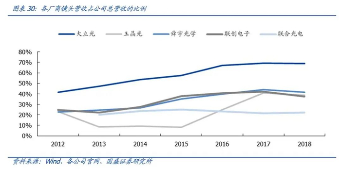 镜头是一个技术门槛较高的行业,行业格局集中度较高。从市场格局看,行业集中度较高,并且有进一步提升的趋势。各厂商镜头营收占公司总营收的比例:大立光99%、玉晶光95%、舜宇光学18~22%、联创电子15~20%、联合光电98%。从手机镜头的盈利能力来看,大立光的毛利率比舜宇光学高20个百分点,玉晶光的盈利能力于近两年快速修复。