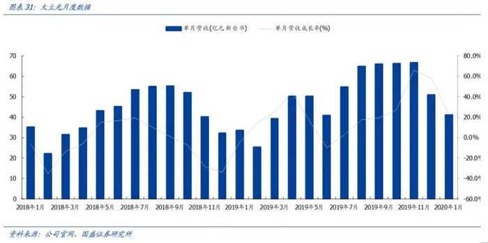 大立光是全球光学镜头龙头企业,具有较强的产品竞争力,保持技术领先地位。近几个月,受益智能手机三摄应用以及6P/7P消耗更多产能,公司营收持续增长。2019年下半年以来,7~12月,大立光分别实现月度营业收入54.73/64.76/65.96/66.26/66.56/ 50.99亿新台币,同比增长3%/18%/20%/27%/66%/58%,同比增速逐渐加快。2020年1月份,公司实现营业收入41.1亿新台币,同比增长22.8%,月度营收淡季不淡,充分证明了整个光学行业的高景气度,龙头公司持续有超预期的表现。